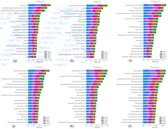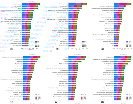 In addition, machine learning techniques were also used to analyze the data [79,80,81]. First, the questionnaire data, the subdistrict variable data, and the POI data were red using the Python 3.12 Pandas library and merged based on the subdistrict name where the respondents reside. Next, feature columns were selected and StandardScaler was employed to standardize these features. Following preprocessing, the data were divided into training and test sets in an 8:2 ratio using the sklearn library. A random forest classification model was then trained with parameters n_estimators = 50 and random_state = 42. Upon completion of the model training, its predictive accuracy on the test set was calculated. Finally, the SHAP package was employed to generate SHAP bar plots, which elucidate the significance each variable within the random forest model.