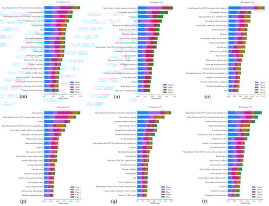 The top 10 important influencing factors in each of the 22 subcategories of demand all covered two types of characteristics, the built environment and the elderly themselves, but from the cross-sectional comparison of these subcategories, we find that with demand for travel companionship, eight factors stemmed from the built environment and only two factors from elderly people’s own attributes, which may be due to the fact that the accessibility of the built environment is highly correlated with the ease of travel for older people. On the contrary, in the five subcategories of repair and troubleshooting, community pharmacy services, rehabilitation and physiotherapy, family doctor, and educational, factors from elderly’s own attributes accounted for 7 out of 10. In addition, in 15 out of the 22 subcategories, the proportion of factors of the characteristics of CECS to the built environment was more than half, which shows again the importance of exclusive elderly resources such as in the built environment. Especially for psychological counseling, the proportions of characteristic of CECS in built environment features were 80%, and 75%, respectively, for both home care and legal assistance. These services are provided in CECSs, which suggests that elderly people who demand them should pay attention to the layout of CECSs in their areas.