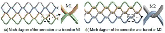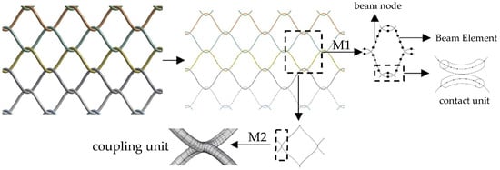 The node coupling model (M1) considers two adjacent nodes at the metal wire connection points as coupled into a single node, representing a connection model where nodes neither separate nor slip, and is simulated using beam elements in ANSYS. The contact connection model (M2) considers the mutual contact pressure between connecting nodes and is simulated using solid elements in ANSYS. The contact boundary problem between two adjacent nodes in metal netting connections with solid contact constraints can be described as finding the displacement field X within the region that minimizes the system’s potential energy under contact boundary conditions, expressed as follows: