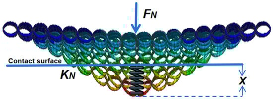 where K, X, and F represent the stiffness matrix, unknown nodal displacement vector, and nodal load vector in the finite element displacement method, respectively, as well as the penetration amount between two bodies. This constrained optimization problem can be transformed into an unconstrained optimization problem by appropriately processing the contact boundary conditions through contact constraint algorithms. The penalty function method for unconstrained optimization assumes a “spring” relationship between contact surfaces. This contact model allows for certain penetration between contact and target surfaces, coordinating force and deformation through contact stiffness (spring). The contact stiffness and contact penetration constitute a penalty function, which is incorporated into our model, as shown in Figure 3, with the penalty function defined as follows: