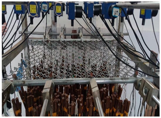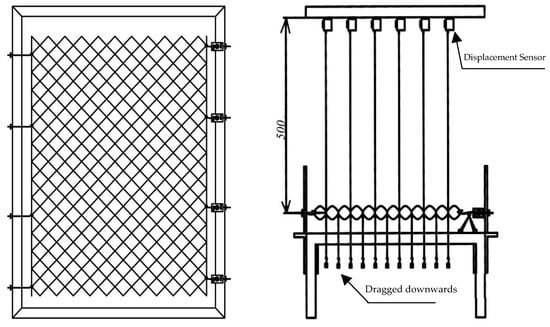 To validate the effectiveness of the numerical simulation method considering pretension effects, a testing apparatus and methodology incorporating pretension effects were designed. The test netting measured 770 mm × 570 mm, with a wire diameter of 3.2 mm and a mesh size of 53 mm for the metal chain netting. The netting material had an elastic modulus of 193 GPa and a density of 6300 kg/m3. To ensure uniform force transmission, angle steel of 40 mm × 40 mm × 4 mm was selected for the test frame. Pretension was applied unidirectionally with four tension points on each side, with tension forces measured through force sensors. The chain netting was tested under five initial pretension (FT) conditions: 200 N, 250 N, 300 N, 350 N, and 400 N; four concentrated load (FN) conditions: 80 N, 90 N, 100 N, and 110 N; and four distributed load (FD) conditions: 8 N, 9 N, 11 N, and 12 N. Both concentrated and distributed loads were applied statically by hanging mass blocks at chain netting nodes. Wire displacement at measurement points was measured using a WXY80 wire-pull current pulse displacement sensor, as shown in Figure 5.