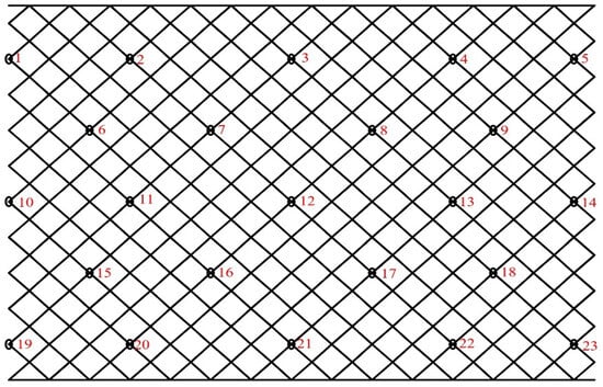 The metal netting was configured with 1 concentrated load point and 59 distributed load points, as shown in Figure 6, and 23 vertical displacement measurement points, as shown in Figure 7. All loads were applied perpendicular to the netting plane, with load application points and displacement measurement points illustrated in Figure 8.