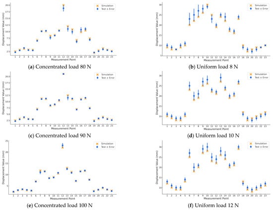 Figure 9 presents the validation of the numerical simulation against the experimental results for vertical displacements at 23 measurement points under concentrated and distributed loads. During testing, the initial chain netting pretension (FT) was 200 N, with concentrated loads (FN) of 80 N, 90 N, and 100 N, and distributed loads (FD) of 8 N, 10 N, and 12 N. The vertical displacement refers to the change in vertical direction measured by wire-pull displacement sensors after load stabilization.