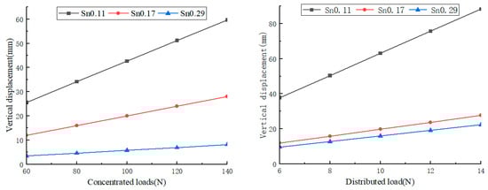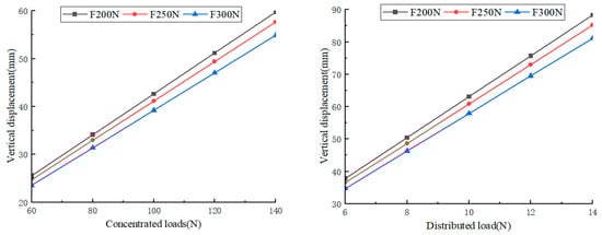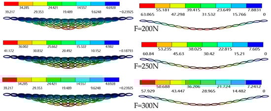 Pretension involves pre-stretching the metal netting wires, utilizing this pre-stretch to generate static friction force between connected components through compression, thereby transmitting tension and deformation. To investigate the effects of netting solidity and initial pretension FT on netting deformation, numerical simulations were conducted under two loading conditions: concentrated loads of 60 N, 80 N, 100 N, 120 N, and 140 N and distributed loads of 6 N, 8 N, 10 N, 12 N, and 14 N, combined with three initial pretension conditions of 200 N, 250 N, and 300 N. The vertical displacement of the metal diamond chain netting was analyzed for three solidity values, which are shown in Table 3.