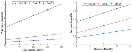 Figure 10 illustrates the variations in the vertical displacement of netting with different solidities under concentrated and distributed loading conditions at an initial tension of 200 N. Figure 11 shows the changes in netting forces for different solidity values of metal netting under increasing concentrated and distributed loads with an initial tension of 200 N.