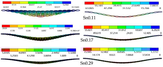 A further comparison of deformation performance under different initial pretension levels reveals that, although increasing pretension reduces displacement at measurement points, the degree of improvement is significantly lower than that achieved through increased solidity. This indicates that initial pretension acts as a secondary adjustment factor in structural optimization. Overall, both solidity and initial pretension positively influence the performance of the chain net structure; however, solidity plays a more dominant role in enhancing structural stiffness and controlling deformation, making it the primary parameter governing the mechanical behavior of the metallic chain net.net deformation.