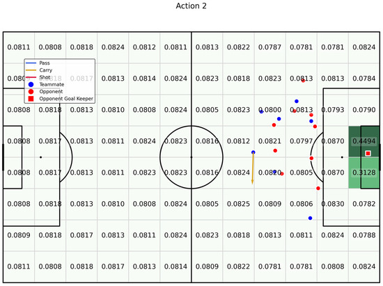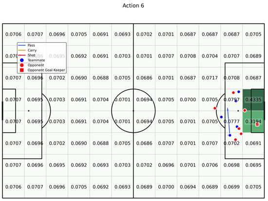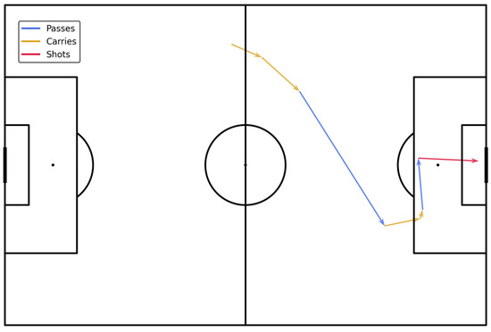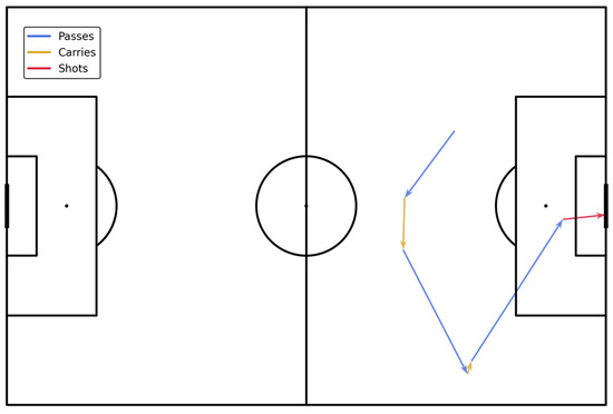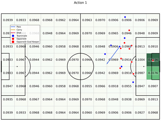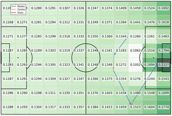 The terms , , and in (1) refer to the actions taken by players in possession of the ball to transition the game to a state where they have an increased likelihood of scoring. These game states align directly with the states of the Markov model [16]: players shift the game from one state to another through passes or carries until reaching an absorbing state, such as a goal or a possession turnover.
