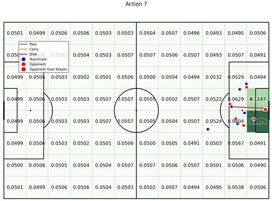 Additionally, the actual xG of an action, combined with the hypothetical xG values across all pitch grids, allows us to compute the transition probability matrices that we defined in Section 3.3: .