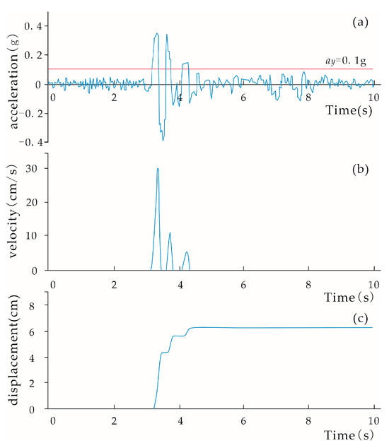 where α represents the slope angle or equivalent sliding angle of the arc. By integrating the portion of the acceleration time-history records that exceeds ay, the velocity time-history of the sliding mass can be obtained (Figure 2b). A subsequent integration of the velocity time-history then yields the permanent displacement of the sliding mass (Figure 2c). The permanent displacement calculation program in this study was developed by Python (version 3.11.5).