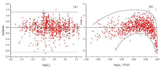 The distribution of residual points of log(u) in Model 1 with fitting parameters. (a) Distribution with log (Ia); (b) distribution with log (ay/PGA).