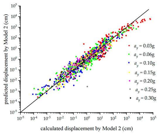 By substituting the data parameters into Equation (10), predicted displacement values were obtained and compared to the calculated displacements, as illustrated in Figure 4. When calculated displacements are small (<10−2 cm), Model 1 may overestimate landslide deformation (Figure 4). Conversely, as calculated displacements increase, predicted values may fall below actual values, exhibiting a nonlinear trend.