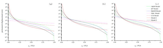 Comparison of 7 empirical models. (a) PGA = 0.05 g, Ia = 0.1 m/s; (b) PGA = 0.1 g, Ia = 0.4 m/s; (c) PGA = 0.2 g, Ia = 1.5 m/s.