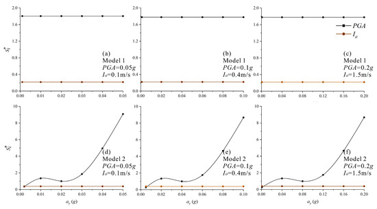 Sensitivity analysis of Model 1 and Model 2. (a) Model 1, PGA = 0.05 g, Ia = 0.1 m/s; (b) Model 1, PGA = 0.1 g, Ia = 0.4 m/s; (c) Model 1, PGA = 0.2 g, Ia = 1.5 m/s; (d) Model 2, PGA = 0.05 g, Ia = 0.1 m/s; (e) Model 2, PGA = 0.1 g, Ia = 0.4 m/s; (f) Model 2, PGA = 0.2 g, Ia = 1.5 m/s.