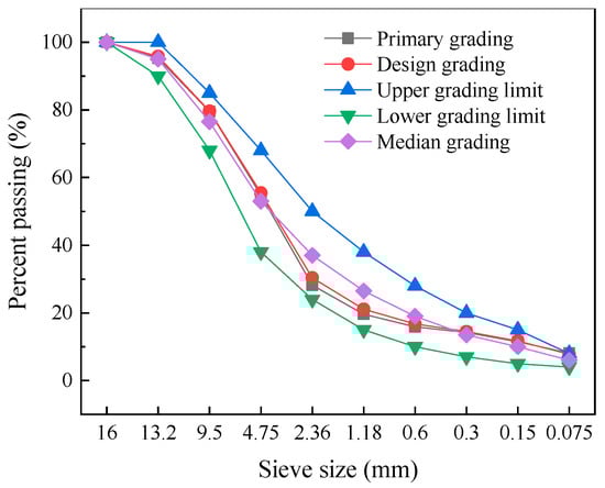 In addition, the long-term operation of asphalt pavement and the process of in situ hot raking inevitably lead to the refinement of aggregate gradation. Therefore, some coarse aggregate usually needs to be added to a recycled asphalt mixture to optimize the gradation. According to the screening results of the RAP, the synthetic gradation of the hot-in-place recycled mixture used in this study is 85% RAP + 15% new material, and the design gradation is shown in Figure 1 below.