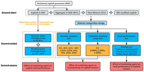 To address these gaps, this study develops a novel vegetable oil regenerant through the dehydration and filtration of waste palm oil blended with plasticizers and anti-aging agents, using petrochemical-based regenerants as benchmarks. The research methodology involves three phases: (1) determining optimal dosage via dynamic shear rheometer and bending beam rheological tests on aged asphalt; (2) analyzing viscoelastic effects on asphalt mixtures through uniaxial dynamic modulus tests and trabecular bending creep tests; (3) evaluating road performance via rutting resistance, trabecular bending, freeze–thaw splitting, and immersion Marshall stability tests. The findings provide theoretical guidance for expanding the selection and application of asphalt reclaiming agents.