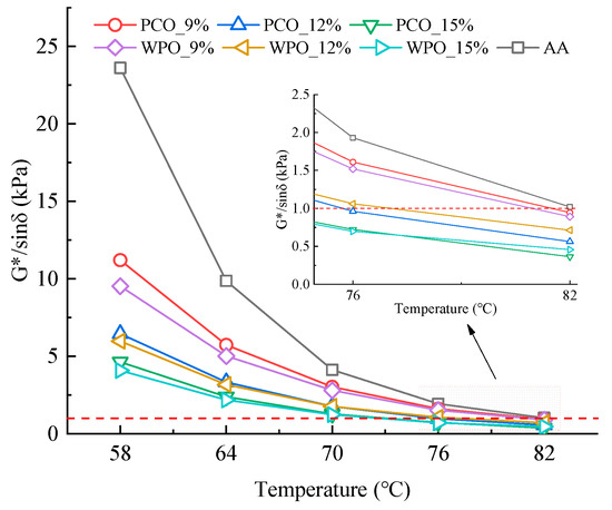 The DSR test results can be calculated to obtain two viscoelastic parameters, including the complex shear modulus G* and the phase angle δ, where the G* represents the total asphalt resistance of repeated shear deformation and the δ reflects the relative ratio of asphalt’s elasticity and viscosity [24]. The SHRP specification adopts the rutting factor G*/sinδ to evaluate the asphalt performance graded (PG) and requires G*/sinδ not to be less than 1.0 kPa [25]. The DSR test results of asphalt under different types and dosages of rejuvenating agents are shown in Figure 3.