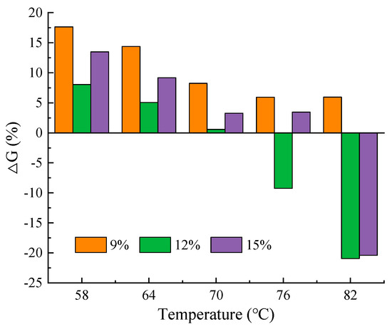 It can be seen from Figure 3 that the effects of regenerant and temperature on the high-temperature performance of asphalt are consistent; that is, with the increase in temperature and the increase in the content of regenerant, the rutting factor of the asphalt decreases. According to the SHRP grading standard, the high-temperature grade of the original aged asphalt is PG82; when the content of the reclaiming agent is increased from 9% to 15%, the high-temperature grade of the recycled asphalt is reduced from PG76 to PG70, and the high-temperature performance of the asphalt becomes worse. This is because the main components of the regenerants are aromatic hydrocarbons and saturates, which have a small molecular weight and can penetrate and soften the aged asphalt. On the other hand, it can be found that the effects of the two regenerants on the high-temperature performance of the aged asphalt are not exactly the same, which is manifested in the difference in the rutting factor under the same dosage and temperature conditions. In order to further analyze the difference in the influence of the two regenerants on the high-temperature performance of asphalt, ΔG was used. The ΔG expression is defined as follows: