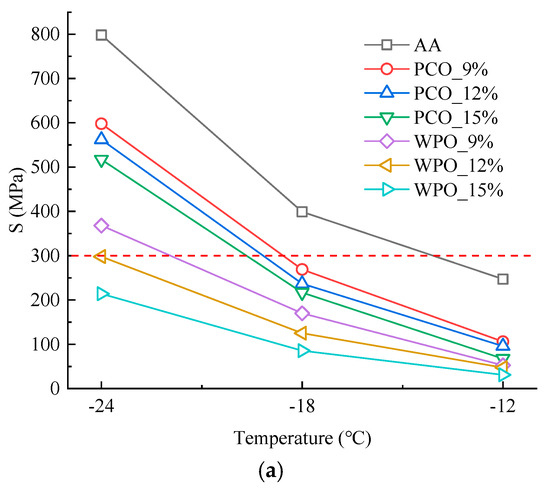 As can be seen from Table 8, the addition of a regenerant improves the dissipated energy ratio of the asphalt mixtures, which means that the addition of regenerant speeds up the energy dissipation in the asphalt mixtures, which is extremely favorable for the timely release of thermal shrinkage stress. With the increase in stress level, the dissipated energy ratio of the asphalt mixtures shows an increasing trend, which indicates that the energy stored in the asphalt mixtures is more easily released. Under the same stress level, the value of Wd/Ws of the three asphalt mixtures is WPO + RAP > PCO + RAP > RAP, which means that the waste palm oil more easily achieves crack resistance by releasing strain energy under low-temperature load conditions.