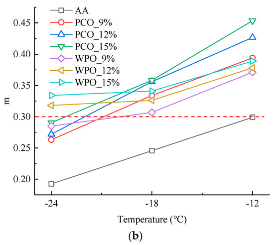 S and m of recycled asphalt: (a) S–temperature curve (b) m–temperature curve.