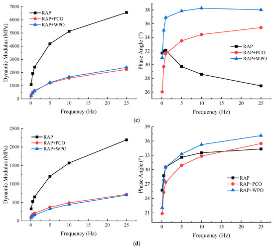 The uniaxial compression dynamic modulus test results of the RAP, petrochemical-oil-based recycled asphalt mixture (RAP + PCO), and waste-palm-oil-based recycled asphalt mixture (RAP + WPO) under different frequency and temperature conditions are shown in Figure 6a–d.