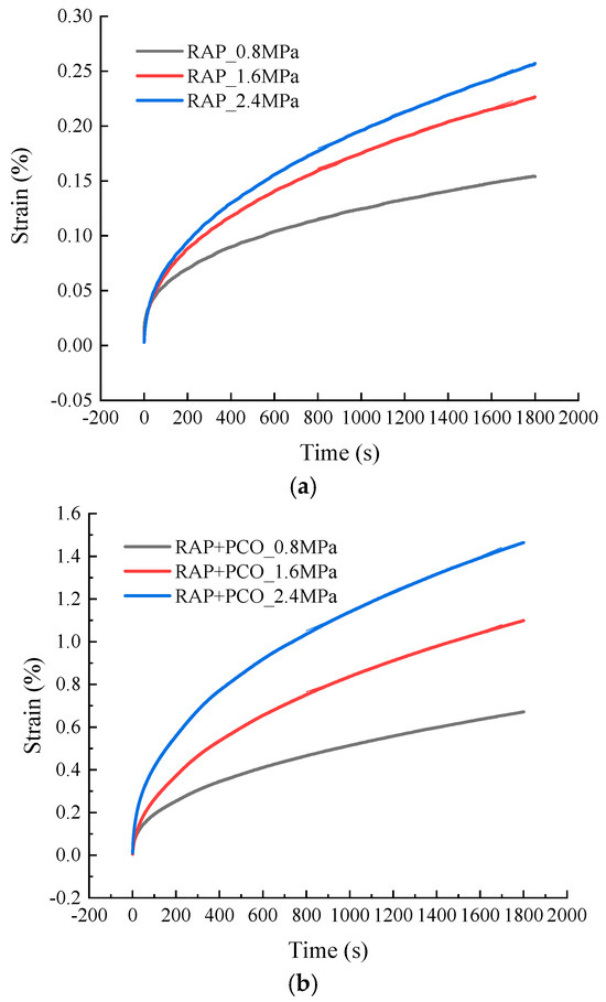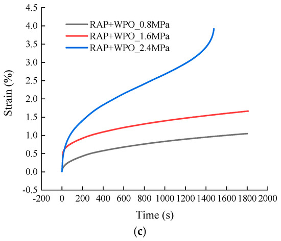 Creep test results: (a) RAP creep curve; (b) RAP + PCO creep curve; (c) RAP + WPO creep curve.