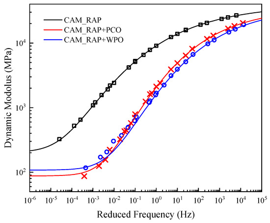 It can be seen that the dynamic modulus of the three asphalt mixtures shows consistency with changes in temperature and frequency. As the temperature decreases and the frequency increases, the dynamic modulus of the asphalt mixtures increases, and the incorporation of the reclaiming agents does not change the temperature and frequency dependence of the mixture. The dynamic modulus of the asphalt mixture is significantly reduced, and the phase angle of the asphalt mixture is increased by the PCO or WPO. However, the performance of the two bitumen under the same test conditions is not consistent. The specific differences are as follows: the dynamic modulus of the WPO recycled asphalt mixture is lower than that of the PCO recycled asphalt mixture at a low temperature and high frequency, and the opposite is true at a high temperature and low frequency.