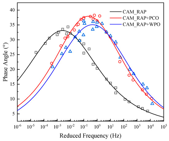 The phase angle development trends of the three asphalt mixtures at different temperatures and frequencies are not consistent. The temperature turning points of the RAP, RAP + PCO, and RAP + WPO are 38 °C, 21 °C, and 21 °C, respectively. When the temperature is lower than this turning temperature, the phase angle of the asphalt mixture decreases with the increase in frequency. At the transition temperature, the phase angle of the asphalt mixture increases with increasing frequency. The reason is that under the condition of low temperature or high frequency, the modulus of asphalt increases significantly, and the asphalt and its mixture exhibit greater elastic properties, while at high temperatures and low frequencies, asphalt mixtures transform into viscoelastic bodies. At this time, the ratio of elasticity of the mixture decreases and the ratio of viscosity increases, and its viscous properties are mainly affected by the asphalt binder. The incorporation of a regenerant changes the temperature sensitivity of the asphalt, which in turn affects the viscoelastic properties of the asphalt mixture.
