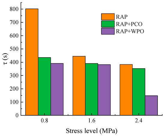 Relaxation time is an important parameter to characterize the change in internal stress of materials over time. The shorter the relaxation time, the faster the dissipation of the internal stress of materials and the better the cracking resistance at low temperature. As can be seen from Figure 8, the addition of a regenerant significantly reduces the relaxation time of the asphalt mixtures. Under the stress levels of 0.8 MPa, 1.6 MPa, and 2.4 MPa, the relaxation time of the petrochemical-oil-based reclaimed asphalt mixture is reduced by 45%, 12%, and 8%, and that of the waste-palm-oil-based reclaimed asphalt mixture is reduced by 51%, 14%, and 61%, respectively. At the same time, with the increase in the stress level, the relaxation time of the three asphalt mixtures decreases gradually. According to the study, stress and temperature have equivalent effects; that is, the higher the temperature and the greater the stress, the larger the creep strain of the mixture and the shorter the corresponding relaxation time.