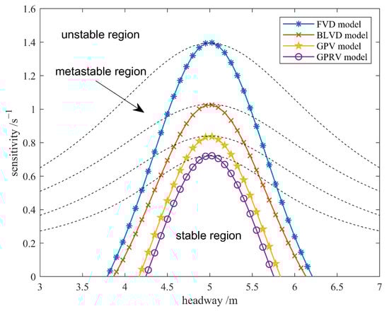 According to Equations (15) and (17), as well as reference [30], the neutral stability curves of the SLVRV and the other three representative models, which are the FVD, BLVD, and SLV models, respectively, in the headway-sensitivity phase space are derived as shown in Figure 1 (the solid curves). To compare our model with previous work, the parameters of the SLVRV and the other three models are set as , , , and .