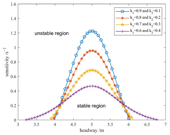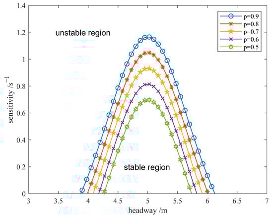 According to the results demonstrated in Figure 1, there are two areas in the sensitivity-headway phase space that are separated by the critical stability thresholds, which are the neutral stability curves. Among these areas, the upper one is the stable area, in which the traffic flow can resist disturbance. Specifically, the disturbance will be compromised and absorbed during its propagation process, and no congestion will be formed by the disturbance. Conversely, the lower area is the unstable area, in which the traffic flow is qualified to resist disturbances. Under this condition, congestion will be eventually formed by the disturbance during its propagation process, and the density waves will emerge caused by the disturbance.