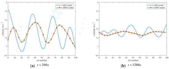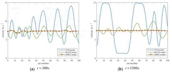 Although the BLVD, SLV, and SLVRV models require different times to suppress the disturbance and the suppressed results are different, as shown in Figure 4 and Figure 5, the system can return to the initial stable state or reach a new stable state with these models. In contrast, the disturbance of the same scale cannot be suppressed by the system with the FVD model and leads to an unstable state of the system. As shown in Figure 4a, the disturbance was amplified in the propagation process in the system with the FVD model and resulted in a large range of speed fluctuations when the disturbance was exerted in the system for 300 s. Under the same conditions, disturbances with the same scale are not amplified during their propagation in the other three models. As shown in Figure 4b, the “separation” and “clustering” phenomenon of velocity distribution emerge in the system with the FVD model at . That is, vehicles in the system with the same velocity and headway at the initial time are differentiated and gathered into multiple “vehicle clumps”. In the same clump, the velocity of the vehicles is approximately the same, the headway of the vehicles is small, and the density of vehicles is high. Regarding the distribution of velocity, these “clumps” fluctuate between approaching a stop and approaching the maximum, which is a typical “stop-and-go” phenomenon. This phenomenon does not appear in the other three models. As shown in Figure 5a, the disturbance exerted at the initial time has been suppressed by the system with the SLVRV model to a relatively small scale when . The velocities of the vehicles in the system are evenly distributed around the initial velocity, and there is no “separation” or “clustering” phenomenon. As shown in Figure 5b, the disturbance has been basically absorbed by the system. The velocity of the vehicles in the system basically maintains the initial speed with little deviation, and the system has returned to a relatively stable state. The above results are consistent with the theoretical analysis in Section 3 and Section 4, which is also consistent with the phenomenon when the realistic traffic system becomes unstable.