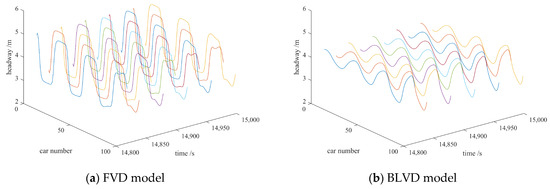 The impact of disturbance exerted at the initial time on the system will be externalized as the deviation of vehicles’ velocity and headway from the initial stable state. To compare the SLVRV model with previous models [8,30,41], the parameters in these models are set as follows: