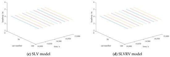 In Figure 6, we can obtain the system state with the FVD, BLVD, SLV, and SLVRV models, respectively, after . As shown in Figure 6a, the disturbance exerted at the initial time cannot be suppressed by the system with the FVD model and grows with its propagation, which will eventually cause the system to become unstable. As shown in Figure 6b, the disturbance cannot be aborded by the system with the BLVD model, but it can be suppressed by the system within a certain scale. As shown in Figure 6c, the system with the SLV model can suppress and then abord the disturbance and has returned to a stable state. As shown in Figure 6d, the system also can suppress and abord the disturbance and has returned to a stable state. Although the effect of the system with the SLV model and the SLVRV model, respectively, is to suppress the disturbance exerted as the same scale at the initial time when , combined with the results of Simulation 1, one can see that there is a certain difference in the stabilization performance of the SLV model and the SLVRV model. On the one hand, it takes less time for the system with the SLVRV model than the SLV model to suppress and abord the disturbance. On the other hand, the fluctuation of vehicles’ motion state during the process of suppressing disturbance in the system with the SLV model is more intense than that with the SLVRV model.