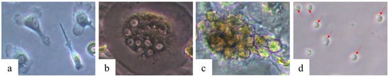 Exemplary cells of the four documented cell variants (classes): (a) ‘1 or 2 cell nuclei’; (b) ‘3 or more cell nuclei’; (c) ‘undefined cells’; and (d) ‘monocytes’ (marked with red arrows).