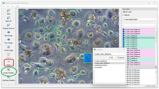 After taking the cell images, the preparations for the AI training began. During training, images and labels must be prepared and processed simultaneously. The labelling is performed manually by highly experienced cell culture experts with LabelImg. As shown in Figure 2, the mode was set to YOLO. Then, in the left-hand toolbar, we selected the folder in which the file to be processed was located and the folder in which the generated labels were to be stored.