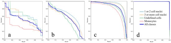 The training data of all four classes was prepared so that the content of the ‘train’ and ‘val’ folders were identical to start the training. If the model tended towards overfitting (Figure 3d), this indicated that the existing training images were sufficient to extract the relevant features and that no further material needed to be added. If, for example, a curve showed no overfitting in the form of a maximum for precision and recall, this meant that the training material for this cell type needed to be extended. However, overfitting resembles a form of ‘memorisation and reproduction’ and prevents the actual modelling ability from learning. Therefore, if overfitting occurs, the content of the ‘train’ and ‘val’ folders must be completely different in order to retrain and eliminate this undesirable condition. In this step, the curve returns from the state of overfitting to the desired state of the appropriate fitting.