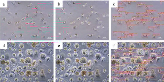 (a,d) Original image of cells with low and high cell density, (b,e) manual counting of images (a,d) with marking of the cells in consecutive order, (c,f) and AI recognition of images (a,d).
