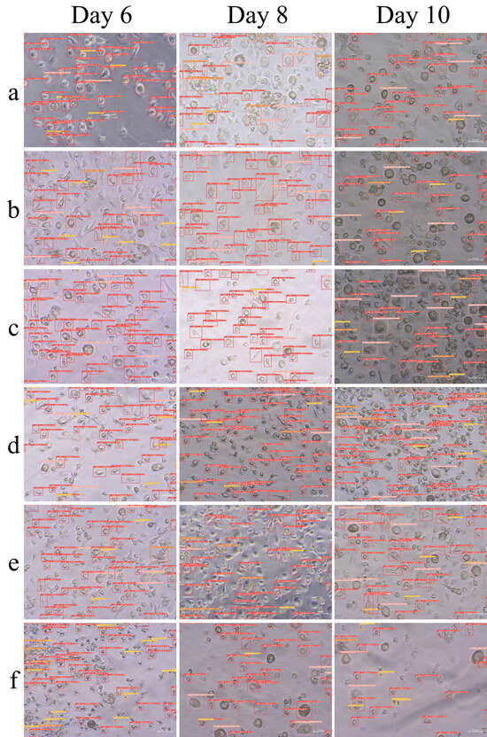 AI-based osteoclast detection on cell culture of 6 different cell culture samples (a–f) on days 6, 8, and 10 with varying ratios of RANKL/MCS-F. The cells of class 1 or 2 nuclei are marked with a red frame, those of 3 or more cell nuclei are marked with a pink frame, those of monocytes are marked with a yellow frame, and undefined cells are marked with an orange frame.