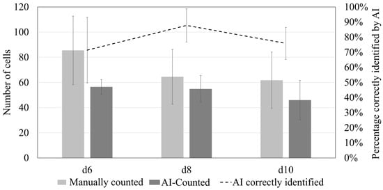After this first check, the correctness of the AI was also compared to the manual count for the culture experiment with varied differentiation supplements. In this analysis, 18 images were evaluated by the AI (see Figure 5). The results of the AI-based image analysis were then compared with the manual counts, as shown in Figure 6. It was found that the recognition rate was higher for simpler image structures, but overall, the time points were analyzed without significant differences in precision. Although the recognition rates of the cells were still expandable at 72–88%, this statement is important for evaluating the current performance of the AI. Moreover, based on the similar shape of the precision–recall curves in Figure 3, it can be assumed that all cell classes were identified equally well or poorly.