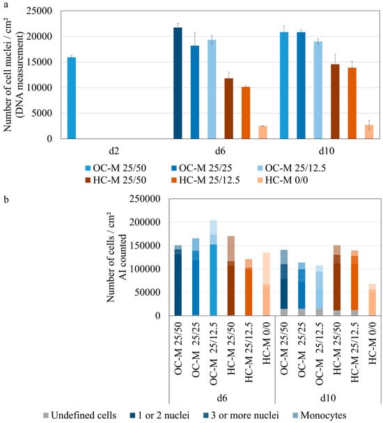 A clear difference can be seen with both measurement methods for the different cultivation conditions. Although the ratios of M-CSF and RANKL do not appear to have a significant influence on OC maturation, the hMSC-conditioned medium causes a lower number of cell nuclei after 6 and 10 days according to the DNA measurement (Figure 7a) and the ability to form three or more multinucleated osteoclasts according to the AI evaluation is significantly reduced (Figure 7b), while especially on day 6 the proportion of MONs is still significantly higher in a standard OC medium. This shows once again that the cells counted in Figure 7b provide a new scope for interpretation according to their type and not just a blunt summation of the cell nuclei. Although the decrease in the number of cells from day 6 to day 10 is confusing at first glance since there is a higher number of fused, i.e., large osteoclasts on day 10, the number of monocytes and so the total number of cells is of course reduced all the more significantly. Thus, a more pronounced drop in the total number of cells after AI counting is a positive sign of osteoclastogenesis. This also explains the lower cell numbers on day 10 for the OC-M compared to the HC-M, which has been shown to have a less pronounced osteoclast-stimulating effect. The nutrient deficiency, combined with the lack of differentiation pressure in the hMSC-conditioned medium without the addition of RANKL and M-CSF, is particularly evident. Here, a significant decrease in DNA can be seen, and on day 10 of the AI evaluation, the total number of cells was significantly lower than in all other culture conditions.