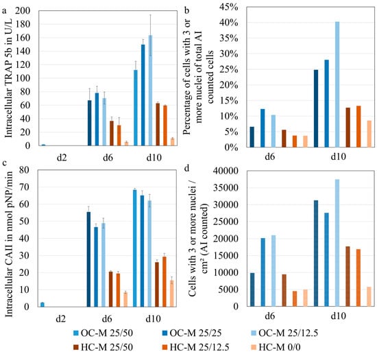 In the selected comparison of carbonic anhydrase CA II (Figure 8c) and the counted number of osteoclasts with three or more nuclei (Figure 8d), the similarities initially appeared to be slight. However, there was a certain proportional correlation between CA II on day 6 and the number of OCs on day 10. This similarity could indicate that the biochemical markers are only reflected with a delay in morphological features that represent osteoclast maturation.