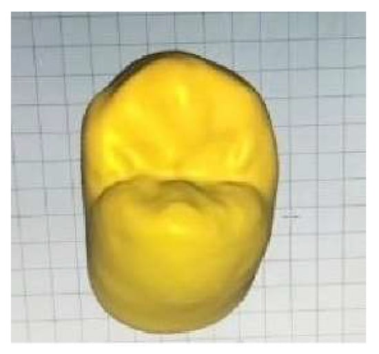 To preserve and reproduce the tooth shape, the acrylic block was placed in a S600 Arti Scanner (Zirkonzahn, Gais, Italy) and the premolar tooth was scanned using the Zirkonzahn Modellier software version 9530, generating the first STL file (STL1) (Figure 4).