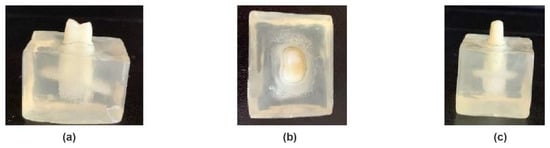 Placement of the premolar tooth in a transparent acrylic block, ensuring proper support and exposure of the coronal area: (a) lateral view, (b) top view, (c) frontal view.