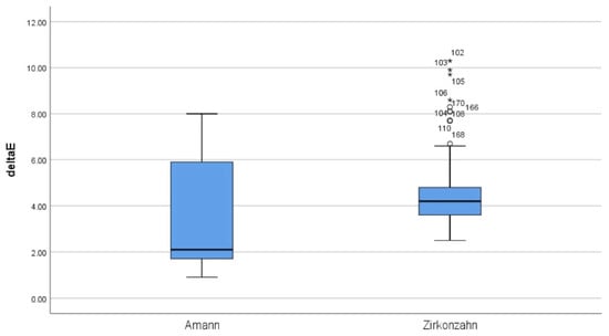 Box plots of the ΔE values related to the three substrates used (metal vs. zirconia, metal vs. natural tooth; p < 0.001; zirconia vs. tooth: p = 0.933) (circles represent outliers).