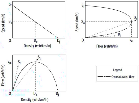 Taking traffic as an auxiliary means to achieve primary goals (social, economic, administrative, etc.), the quality of the network serving users can be defined through time spent in transportation []. As minimizing time is crucial in this case, and there is yet no defined way to stop it, possible directions of action include increasing speed or shortening the route between the source and the chosen destination. These parameters can only serve in the case of a highly simplified problem, because the earlier mentioned intersection of paths (or segments of paths) of a larger number of movements introduces the concept of traffic density into consideration []. The density–speed–flow relationship is defined through a diagram (Figure 1) [].