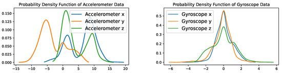 Similarly, the PDFs of gyroscope data, which capture angular velocities, offer insight into rotational dynamics: