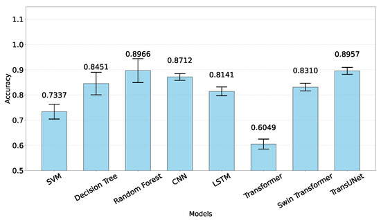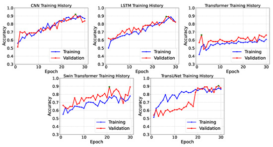 The training dynamics of deep learning models are visualized in Figure 10, which plots the training and validation accuracy across epochs. The TransUNet model demonstrated the strongest learning progression, achieving a peak validation accuracy of 90.54% at epoch 29. The LSTM and Swin Transformer models showed competitive performance (peak validation accuracies of 89.19% and 89.19%, respectively). In contrast, the standard Transformer model exhibited considerably more modest improvements, with validation accuracy plateauing around 66.22%, suggesting particular challenges in capturing relevant temporal patterns with limited training data.