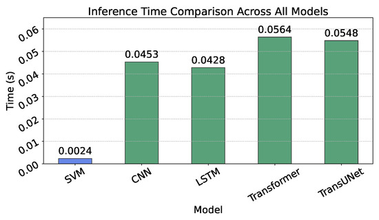 Traditional machine learning models demonstrated superior efficiency, with Decision Tree achieving exceptional performance (inference time: 0.00033 s, parameters: 189, as shown in Figure 12) while maintaining strong accuracy. Despite its superior classification performance, Random Forest required moderately higher computational resources (inference time: 0.00574 s, parameters: 18,486). In stark contrast, all deep learning models exhibited substantially greater computational demands, with Swin Transformer having the longest inference time (0.06217 s) and CNN the highest parameter count (282,059).