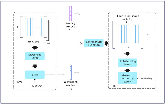 The framework consists of two modules, SCS and TDR. SCS is a convolutional neural network used to perform sentiment analysis on imbalanced data to find out the sentiment bias between ratings and reviews and to obtain the sentiment scores. The output of SCS is the sentiment vector from user U. In addition, we use to denote the rating vector, which comes from the columns of the user–item rating matrix. Based on the vectors and derived from the SCS module, we set up a combinatorial function and take and as inputs to obtain an augmented scoring matrix , which is provided to the TDR trainer. The framework diagram of SCTD is shown in Figure 1.