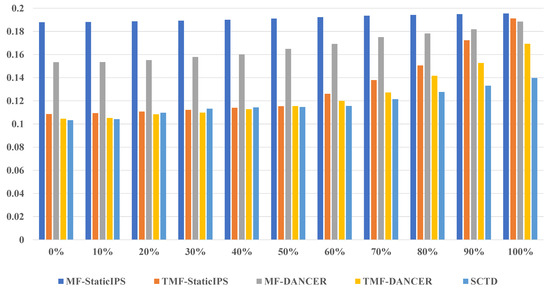 In addition to validating the robustness of the model by constructing the Imbalanced-Yelp dataset, we supplemented our experiments with the Jingdong dataset, which has 25,152 user ratings and only 8310 reviews, and we conducted comparative experiments on such a sparse user ratings–reviews matrix, obtaining the experimental results shown in Table 4. Through the experiments, we could find that SCTD is optimal in all metrics on the Jingdong dataset. It is worth noting that CISD performs causal inference on user reviews to mitigate sentiment bias, and thus, the performance degradation is severe in real scenarios where user reviews are severely missing. While the model TMF-DANCER has less performance degradation, unlike the experiments on the Yelp dataset, the increase in data sparsity causes TMF-DANCER to be worse than our model SCTD in all the metrics. This proves the enhanced robustness of our model in real datasets where data sparsity exists.